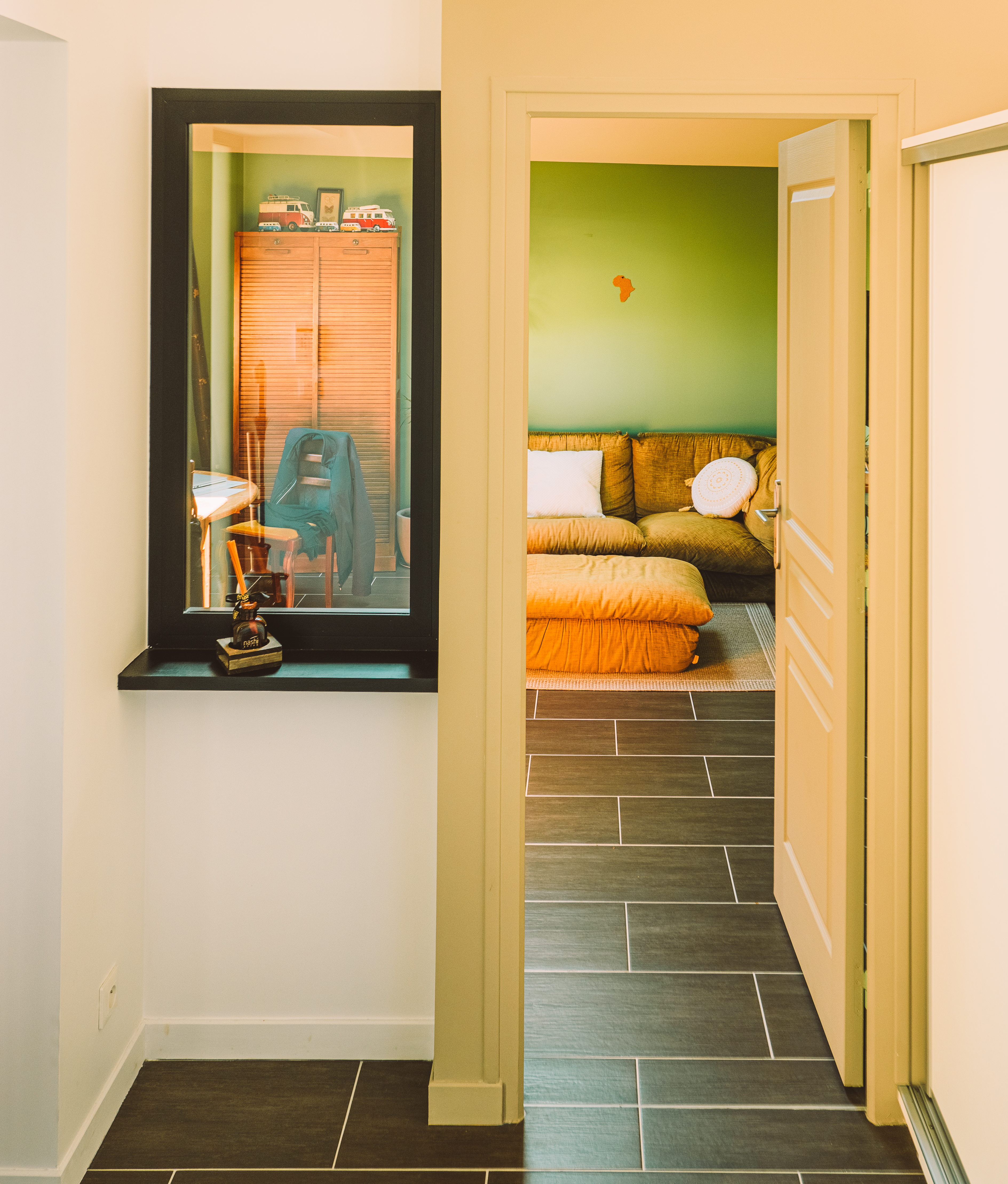 Inséré dans un tissu pavillonnaire, en limite de propriété, le programme consiste à redéfinir et clarifier l’entrée, offrir une pièce de vie largement ouverte sur le jardin et un bureau intime mais central, poste d’observation de la vie dans la maison.