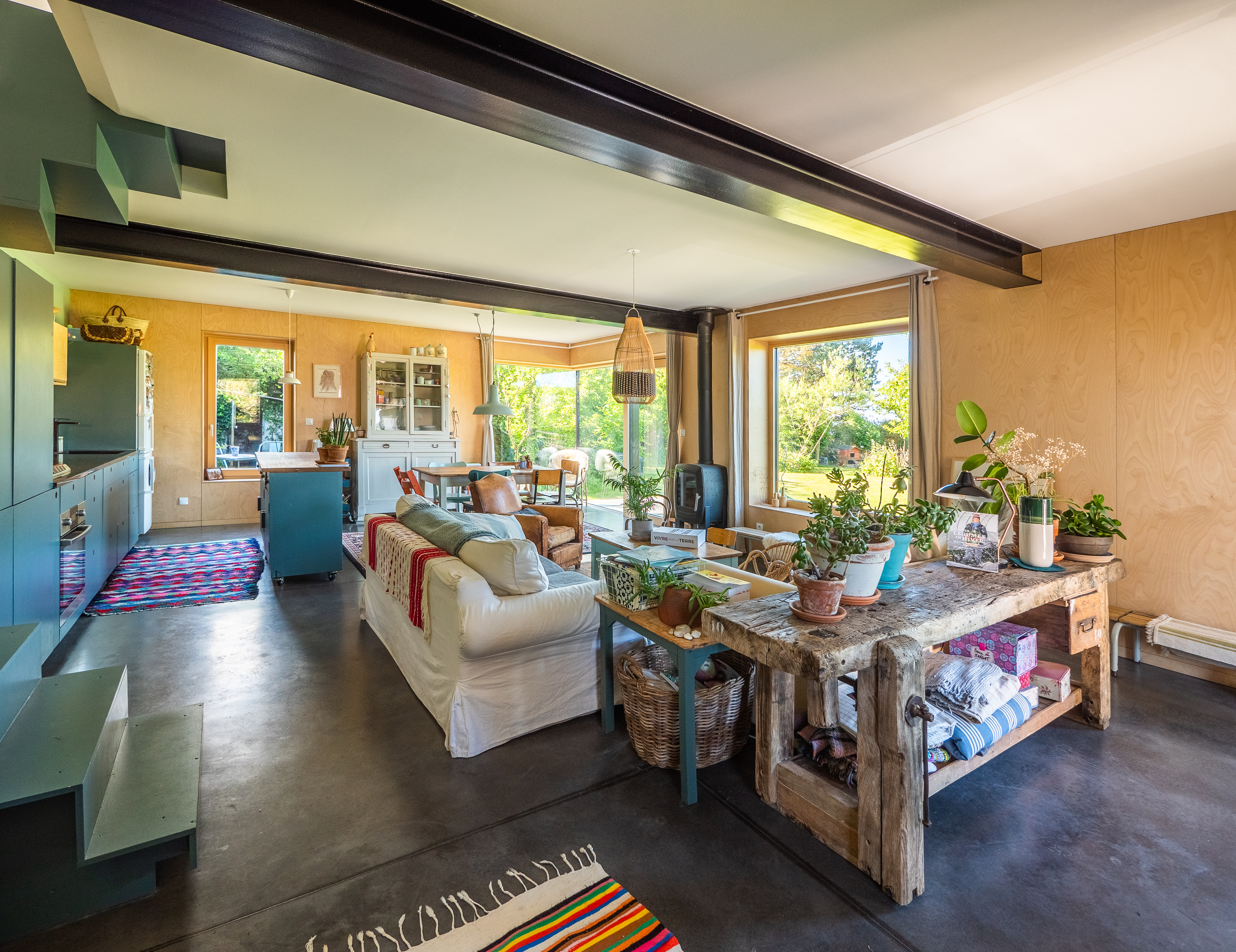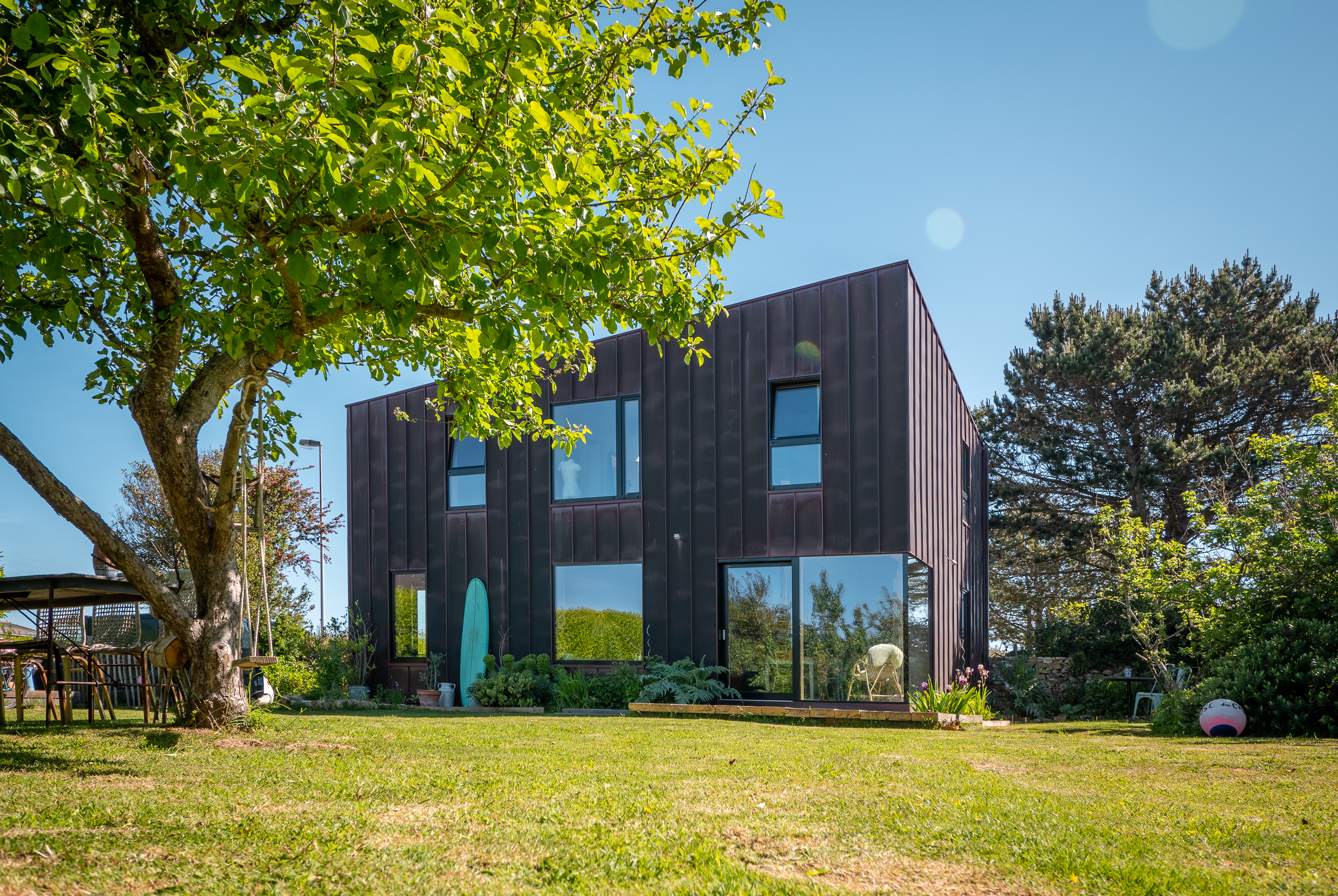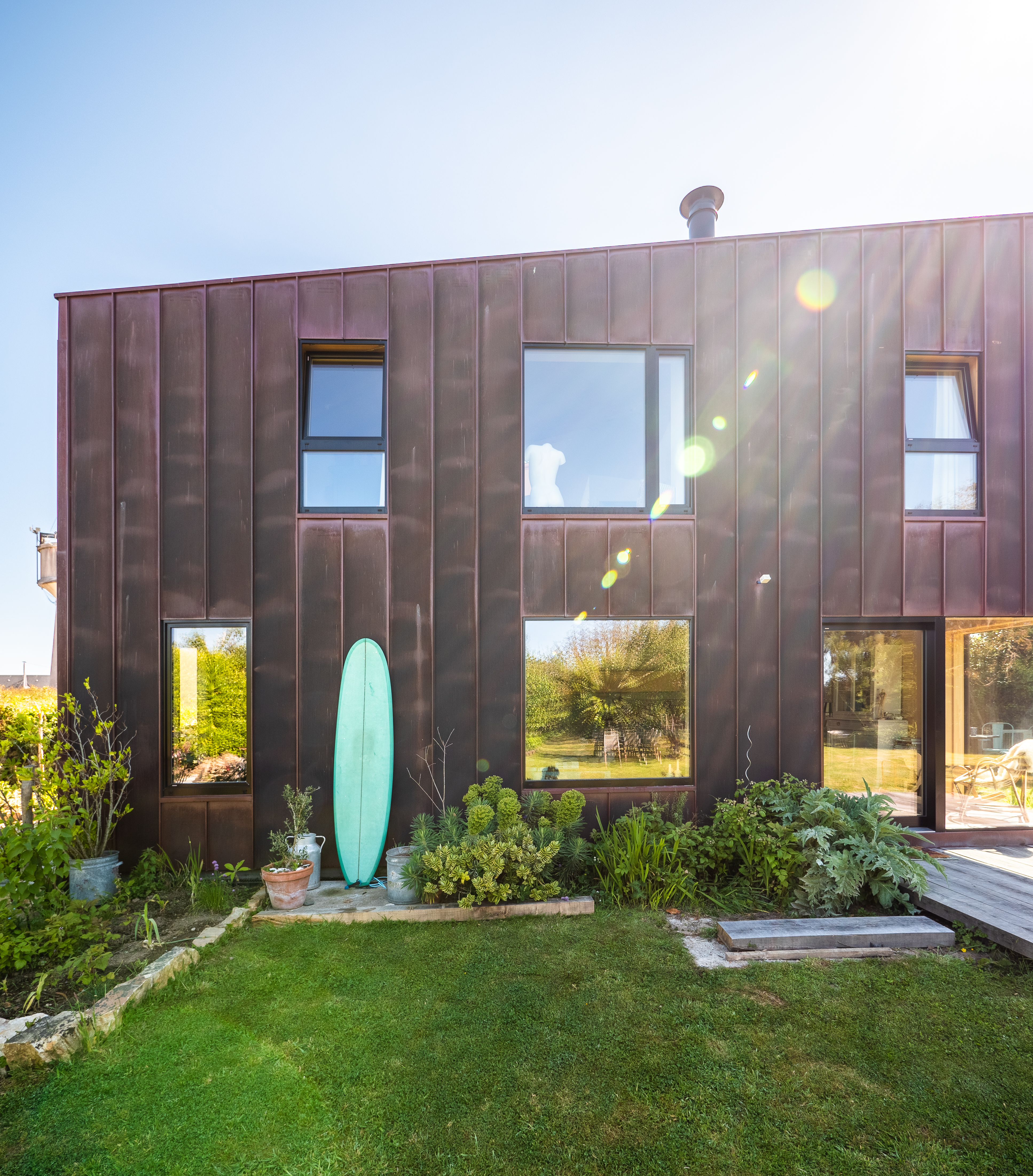 Ainsi la maison vient s’implanter en limite de propriété nord afin de s’ouvrir au maximum sur le paysage et de préserver l’intégralité des arbres fruitiers de variété ancienne. Bien qu’intégré au sein d’un tissu urbain de type pavillonnaire, le terrain, situé dans une poche de végétation, permet de se sentir en pleine campagne une fois passée la porte d’entrée. L’implantation du bâtiment est volontairement proche de la rue afin de limiter l’impact de la construction sur la parcelle riche d’une biodiversité importante. Une petite façade se tourne vers la rue marquant l’entrée. Le stationnement met à distance l’espace public renforçant ainsi la transition entre public et semi-privé tout en limitant au maximum la surface minéralisée. Les autres façades se tournent vers le jardin s’ouvrant généreusement vers le paysage proche et lointain permettant ainsi d’agrandir visuellement les espaces intérieurs. En extérieur c’est sur le cuivre que le choix s’est porté. Utilisé brut, il offre la possibilité d’un réemploi à l’infini et dispose d’une grande durée de vie. Sa teinte, proche des nuances de la végétation environnante, limite l’impact visuel du bâtiment.