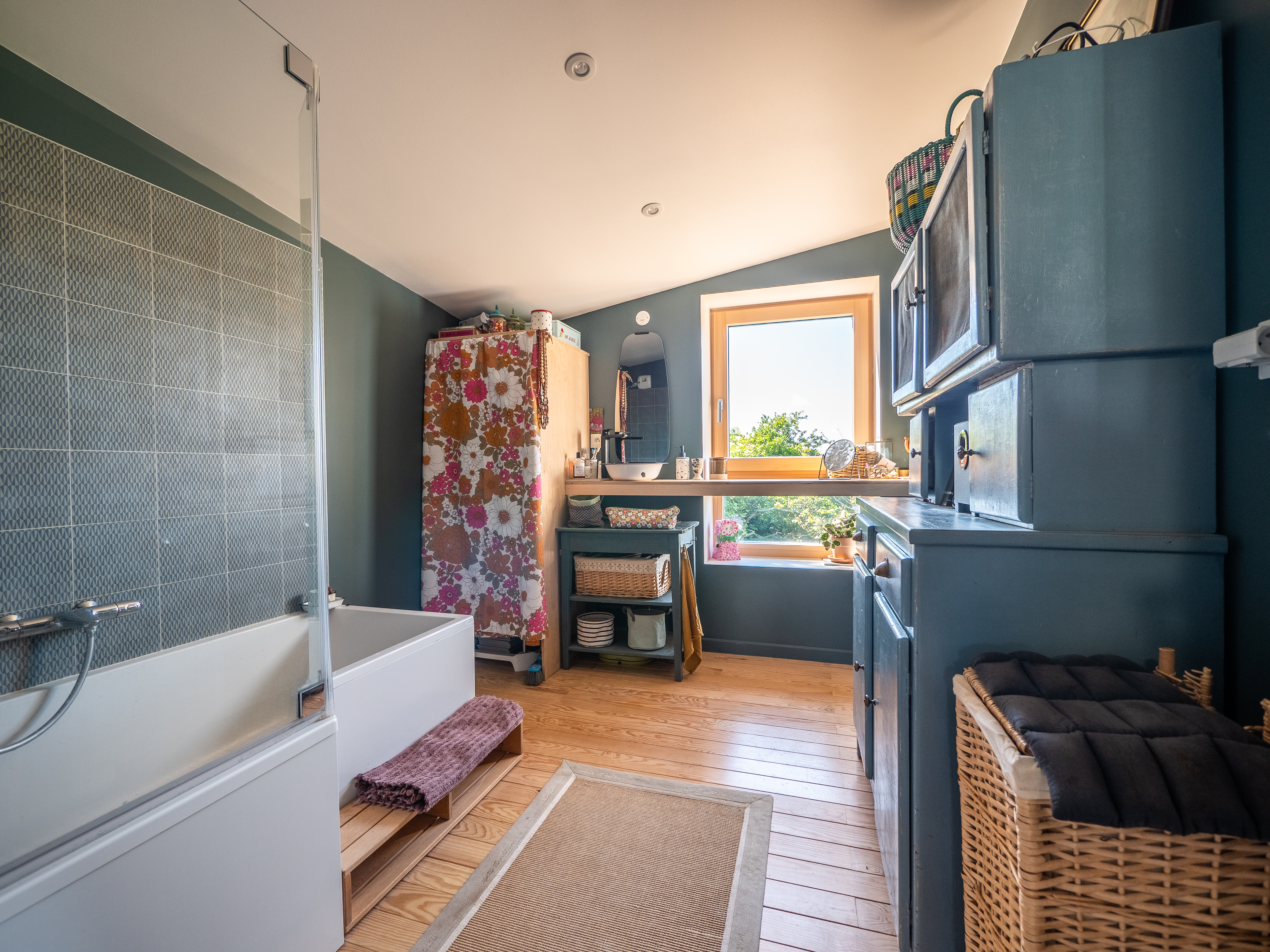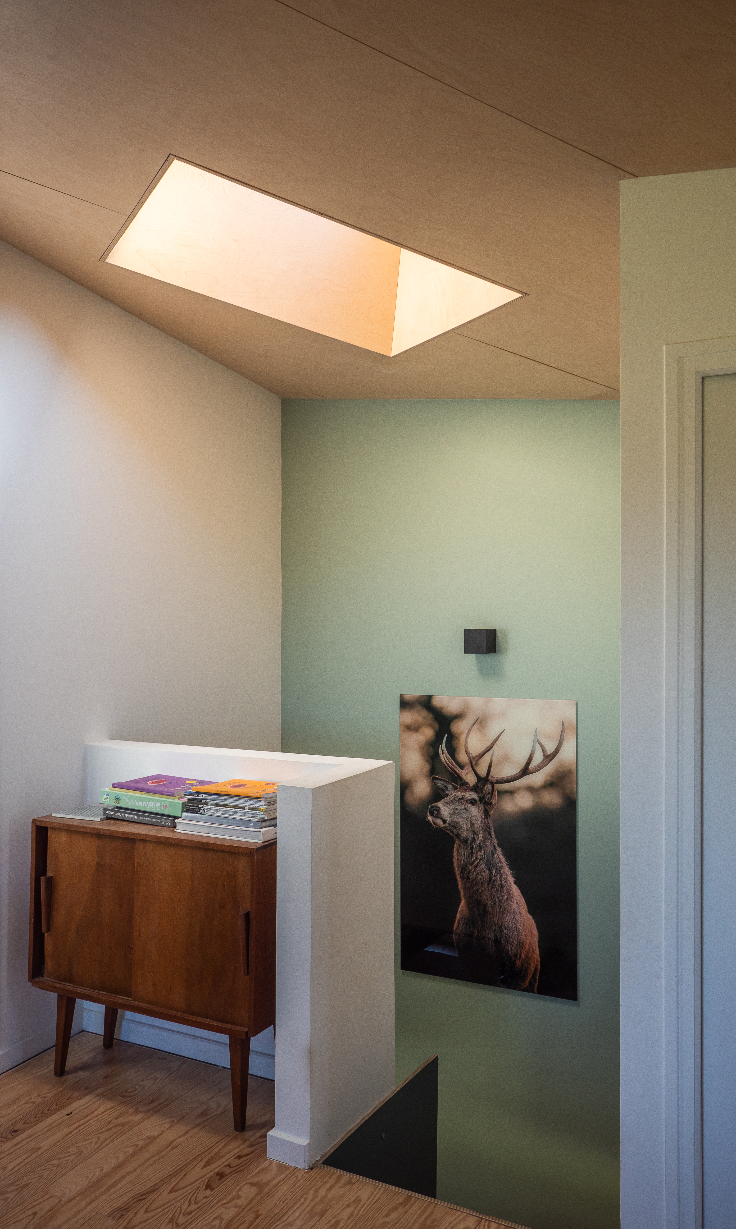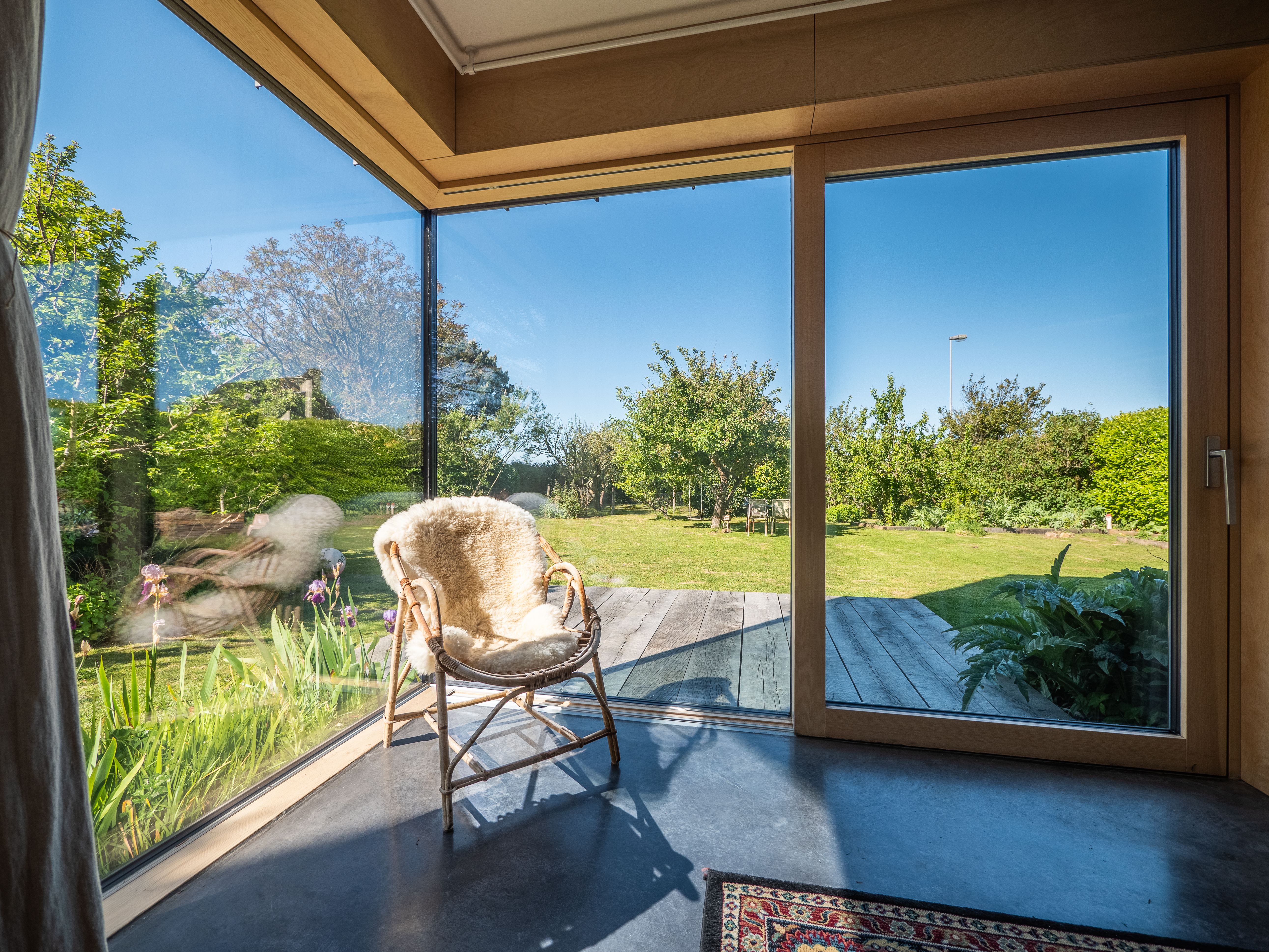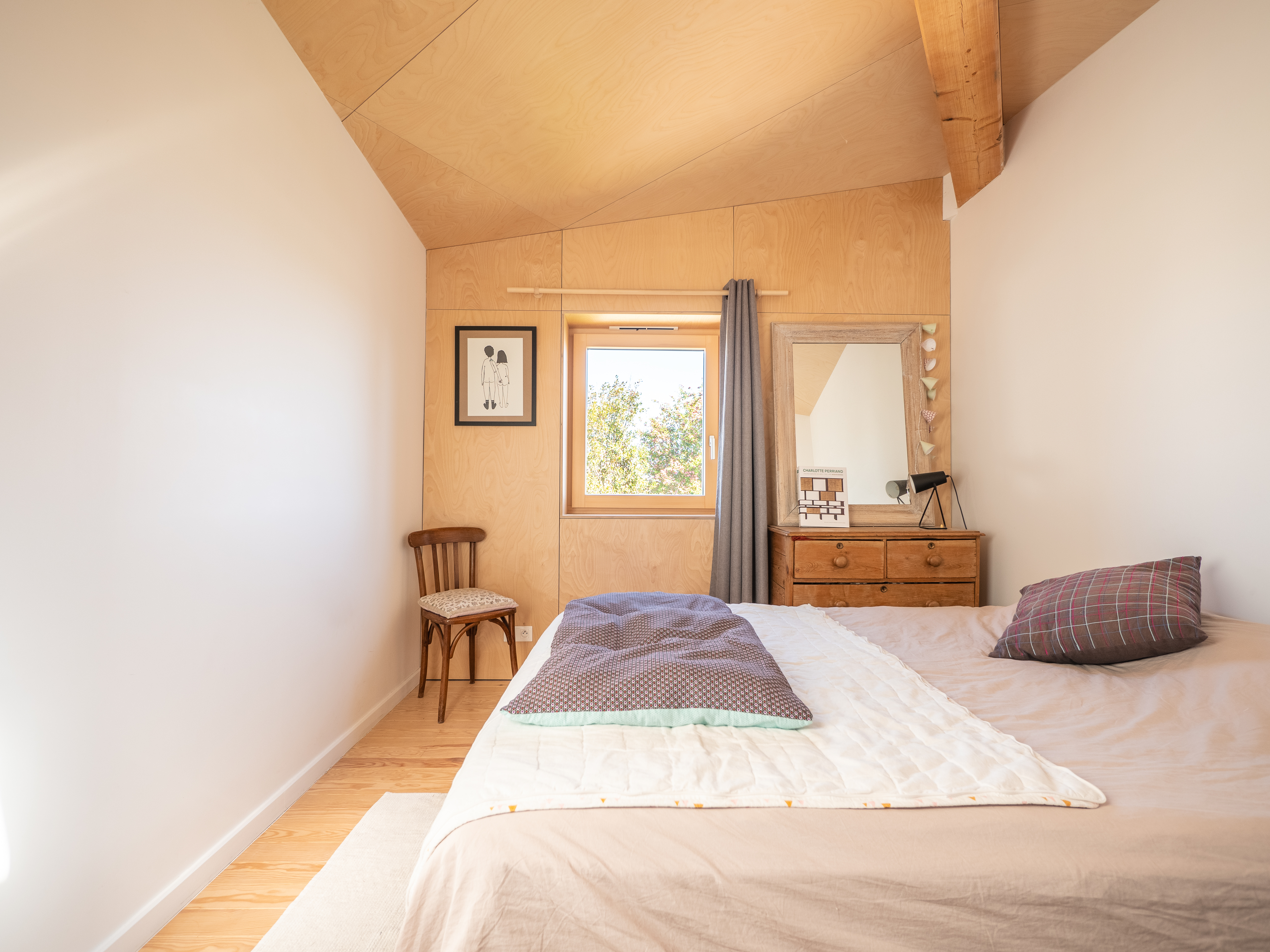 A l’intérieur, le parement bois de type bouleau apporte une ambiance chaleureuse et confortable tout en régulant l’hygrométrie. Toutes les ouvertures de la “cabane” tendent à capter les vues. Au rez-de-chaussée, le lieu de vie se tourne vers le verger créant sa propre cosmogonie. A l’étage, les vues s’orientent vers le lointain, la mer et les îles anglo-normandes de chaque côté avec toujours en premier plan l’impression de vivre dans la cîme des arbres.